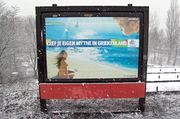 Nieuw-Vennep, 2 maart 2005. Zonreclame in de sneeuw. Foto Dennis Revier. |