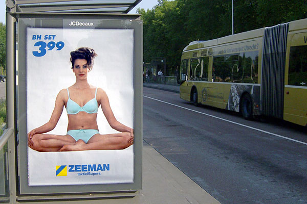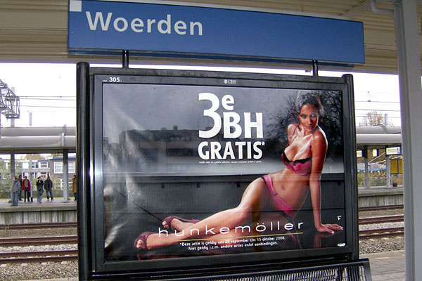 Bunnik, 5 juni 2008. Poserende BN'er. Straks ligt het halve strand dus vol met allemaal dezelfde badpakken. De leuningen van deze bank zijn trouwens niet bedoeld om op te leunen, maar om te voorkomen dat dit perronmeubel als slaapbank wordt gebruikt. Bunnik, 7 juni 2008. Deze mevrouw wacht al meer dan een week op bekijks van de busreizigers. Maar die zijn er niet: de chauffeurs staken voor een betere CAO. |