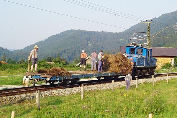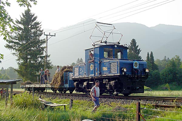 Zugspitzbahn, 29 juli 2005. Hooitrein tussen Grainau en Hammersbach. De foto is gemaakt rond half acht 's avonds, na de laatste reguliere trein op de Zugspitzbahn. Het treintje kwam langs om het langs de baan opgetaste hooi op te laden. Dit trok nogal de aandacht van wachtende automobilisten, want de overweg was lange tijd gesloten zonder dat er een trein passeerde. Vergelijk ook de locjes van de Ammertalbahn. Foto's Hans Hartemink. |
