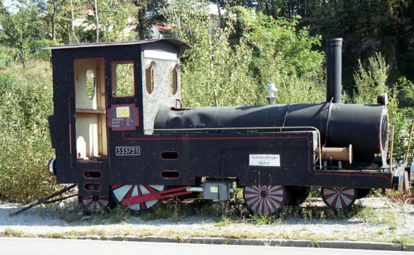 Hauzenberg, september 2009. Loc 55 5791 maar niet heus. Dit is een fantasieloc, opgesteld bij een vroegere steengroeve, tegenwoordig Granitzentrum Bayerischer Wald. Op de zijkant van de loc staat "Hauzenberger Bockerl", de bijnaam van het treintje van Hauzenberg naar Passau. Foto gemaakt door mijn moeder. |