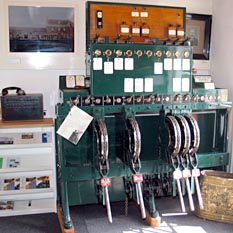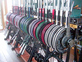 Hoorn, zomer 2004. De werkplek van Jaap de Boer, treindienstleider bij de SHM. Hij schrijft: Het betreft het ongeveer 100 jaar oude seinhuis van Kesteren, dat in 1984 door medewerkers van de SHM voorzichtig is gesloopt en enkele jaren later herbouwd op het tramstation in Hoorn. Het seintoestel is van het "Alkmaarse" HSM-type en is ongeveer 90 jaar oud. De vrijwilligers hebben een ware prestatie geleverd door het aanpassen aan de Hoornse situatie. Alle klassieke seinen, de wissels 5 en 9 en de overweg worden hier vandaan bediend, inclusief de afhankelijkheden zoals flankbeveiliging. Meer foto's van het seinhuis van de SHM. |