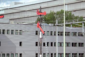 Utrecht GE, 28 augustus 2004. Het inrijsein Utrecht Goederen uit oostelijke richting. Dit is een overblijfsel van het lichtseinstelsel '46. In de achtergrond een van de rouwbrieven op dit emplacement. Dit zijn seinen waarmee toestemming tot rangeren wordt gegeven. Tweede foto: Utrecht GE, 2 november 2005. Op het goederenemplacement wordt druk gesloopt. Het postperron is al bijna verdwenen (zie sloopmachine in de achtergrond). In 2006 zou ook het seinhuis H tegen de vlakte gaan, met de laatste elektromechanische bedienpost in Nederland. Ook de laatste restjes klassieke beveiliging, zoals de rangeerseinen en de armseinen, verdwenen daarmee. |