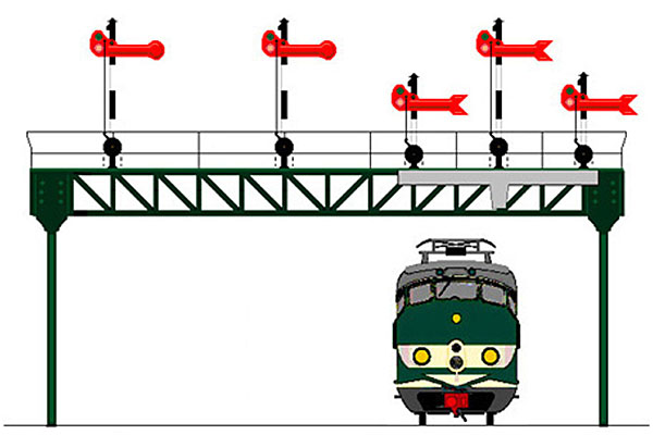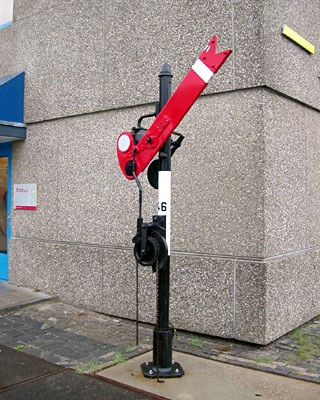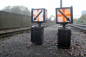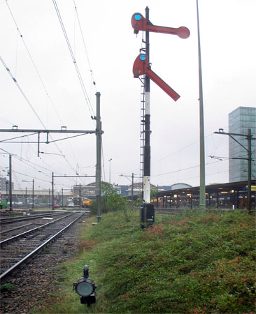 Utrecht, 2 november 2005. Dit moet het laatste actieve armsein van NS zijn geweest: het uitrijsein van Utrecht GE richting het noorden. Het was een hoofdsein gecombineerd met een voorsein en gold voor verschillende sporen. Door middel van vertreklampen (zie hieronder) werd aangeduid voor welk spoor het sein van toepassing was. |