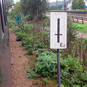 Dieren, 14 oktober 2006. Blokbord (seinreglement 331). Mag alleen worden gepasseerd met toestemming van de treindienstleiding. Blokborden worden gebruikt langs baanvakken zonder seinen, zoals de lijn van de VSM. Met deze borden wordt aangegeven waar een nieuw blok begint, in dit geval blok Ez. |