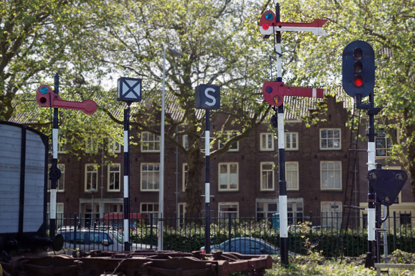 Utrecht, 26 mei 2023. Op het terrein van het Spoorwegmuseum zijn diverse seinen te zien. Zie jij zonder verder te lezen wat er niet klopt? Op de foto staan van links naar rechts een gewoon armsein, een rangeersein ('rouwbrief'), een stoplantaarn, een enkelvoudig vertakkingssein (twee armen), en een lichtsein met richtingaanwijzer ('koeiekop').