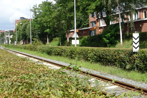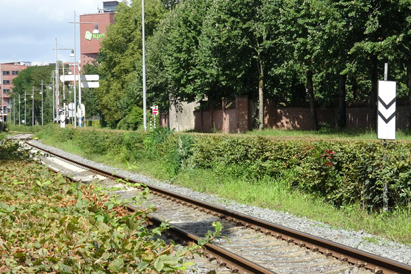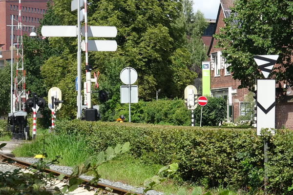 Amersfoort, 2 augustus 2025. Treinen die van de PON-lijn uit Leusden komen, komen bij station Amersfoort sein 5520 tegen. Officieel mag je dit geen dwergsein noemen maar een 'laaggeplaatst lichtsein', hoewel het niet echt laaggeplaatst is. Maar de betekenis is duidelijk: bij groen licht mag hier maximaal 40 km/uur worden gereden. Het sein heeft geen voorsein. In plaats hiervan worden keperbaken gebruikt: drie rechtopstaande borden die ongeveer 60 meter van elkaar vandaan staan. De betekenis is: snelheid verminderen zodat je op tijd kunt stoppen als het sein rood is. De overweg die je op deze foto's ziet is in de Utrechtseweg, zo'n 500 meter voor het station. |
