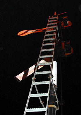 Bunnik, 11 november 2007. Een originele seinvleugel, gekregen van een bevriende kennis. Voor wie het weten wil: 28,5 kilo schoon aan de haak. De vleugel heb ik gemonteerd aan mijn balkon, goed zichtbaar vanuit de trein. Kijk naar links als je uit de richting Utrecht komt. In het donker brandt automatisch een groen licht. In het Victoriaanse Engeland wezen veilige seinen vaak naar omlaag (lower quadrant) in plaats van omhoog (upper quadrant). Welke onderdrukte gedachte zou hier achter zitten? Ik hou mij trouwens nog steeds aanbevolen voor een fluitbord (SR 312). |