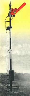 Automatische blokseinpaal, door de NS vanaf 1926 gebruikt op een aantal trajecten. De seinen waren afkomstig uit de Verenigde Staten. Duidelijk te zien is dat ze ontworpen zijn voor een stelsel waarbij de seinen drie standen konden aannemen: veilig (recht omhoog), waarschuwing (schuin omhoog) en stop (horizontaal). De NS hield echter vast aan aparte hoofdseinen en voorseinen, en gebruikte dus maar twee standen. Het venster voor de derde lamp was dichtgemaakt. Literatuur: Op de Rails, 1965/SW, 3.2. De illustratie komt uit het boekje "Seinwezen" uit 1941. Hieronder een deel van de tekst uit dat boekje: De normale stand van de door de seinhuiswachters met de hand bewogen blokseinen is „onveilig". In dezen stand wordt slechts verandering gebracht om den naderenden trein het „veilig" te toonen. Zoodra de trein het blok is gepasseerd, wordt het sein weer onverbiddelijk in zijn onveiligen stand teruggebracht. Anders is het met het zoogenaamde zelfwerkende blokstelsel. Hier is de normale stand van het sein „veilig". Rijdt een trein het aldus beschermde blok binnen, dan valt automatisch de arm op onveilig door het verbreken van een electrischen stroom. Op de baanvakken Gouda—Oudewater, Dordrecht—Willemsdorp, Tilburg—Gilze-Rijen, Weesp—Kerklaan, Utrecht—Vleuten en Berkum—Dedemsvaart is dit kostbare stelsel tot stand gekomen. Het vereischt geen personeel, de trein doet het zelf. Het voordeel van het zelfwerkende blokstelsel is, dat het sein op onveilig komt te staan als door welke oorzaak dan ook een onderbreking of kortsluiting van den stroom in de spoorstaven zou ontstaan, dus ook bij een railbreuk. Ook dan immers wordt de stroomloop verbroken en doen de seinen hun werk. Een klein nadeel is het evenwel, dat de onveilige stand ook wordt aangenomen, wanneer een volkomen onschuldige oorzaak den cirkelgang van den electrischen stroom onderbreekt, bijvoorbeeld als een geit met een stuk ketting aan den hals over de spoorbaan zou wandelen. |