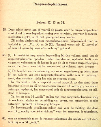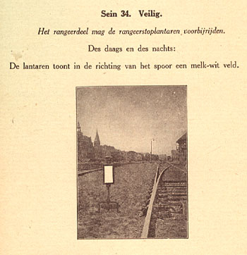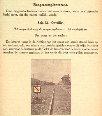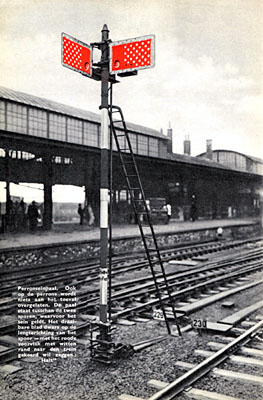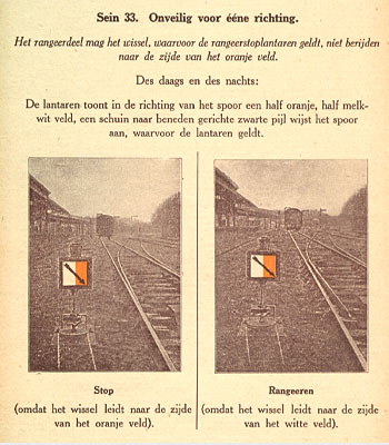 Amsterdam CS, 1 december 1968. Treinstel 682 naast een paar rangeerstoplantarens. Uit het Seinreglement 1934: "De lantaren toont in de richting van het spoor een oranje staand kruis op een melk-wit veld; een schuin naar beneden gerichte zwarte pijl wijst het spoor aan, waarvoor de lantaren geldt. Geldt de lantaren voor de beide sporen, waartusschen de lantaren geplaatst is, dan wordt dit door twee pijlen aangegeven." Wordt de lantaren vanuit het seinhuis gedraaid, dan verschijnt er in de richting van het spoor een melk-wit veld: het rangeerdeel mag doorrijden. |