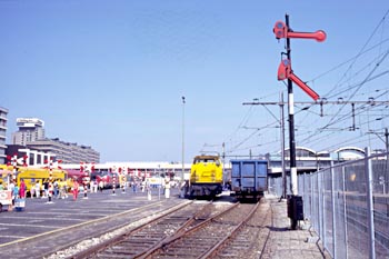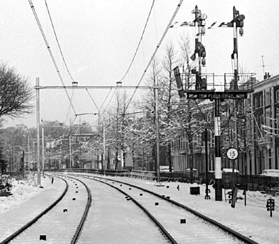Amsterdam Muiderpoort, 9 juli 1973. Twee armseinen met vertakkingslichtsein (koeiekop), daarnaast een gecombineerd armhoofdsein en -voorsein. Onder de vertakkingsseinen hangen bordjes met snelheidsinstructies. Als deze seinen volledig als armsein waren uitgevoerd, dan had er een enorm bordes moeten staan, met een stuk of zeven palen erop. Deze seinen beveiligen het treinverkeer van Hilversum naar Amsterdam CS. De sporen helemaal rechts zijn bestemd voor het treinverkeer tussen het CS en de Watergraafsmeer. Ter vergelijking de situatie op 21 juli 2004. Bij het armseinstelsel vond men het belangrijk dat de machinist wist naar welk spoor hij werd geleid. Bij het lichtseinstelsel is het belangrijkste dat de machinist weet hoe snel hij mag rijden. Klik hier voor meer foto's op dit station. |