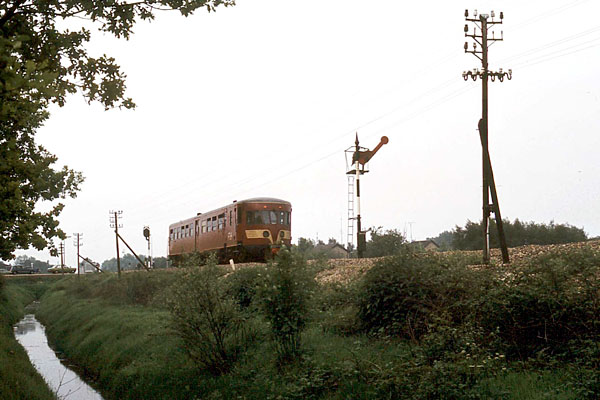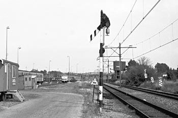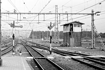 Vroomshoop, 1 juni 1984. NS 25 op weg van Almelo naar Mariënberg, enkele weken voordat de klassieke beveiliging op deze lijn zou verdwijnen. In de verte een afgekruist nieuw lichtsein. Op de voorgrond een elektrisch bediend armsein van een bijzonder model. Het is een uit de VS afkomstig armsein dat vanaf de jaren dertig dienst deed langs baanvakken met automatisch blokstelsel. Deze seinen werden in de VS gebruikt als driestandensein, en hadden dus plaats voor drie kleurglazen. Ze zijn op een afstand goed te herkennen aan de gepunte paal. Bij de NS werden ze als tweestandensein gebruikt. Toen langs deze automatische trajecten lichtseinen werden geplaatst, verhuisden verschillende oude armseinen naar andere baanvakken. Foto Fons van der Jagt. |