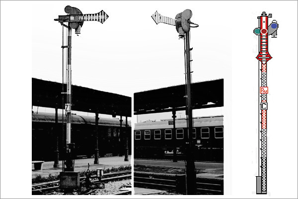 Hof, 2 september 1972. Een typisch Beiers armsein, te herkennen aan het model van de vleugel. De sleuven in de vleugel zorgden ervoor dat de wind er minder vat op kon krijgen. Een bijzonderheid was dat deze seinen soms ook in een ruststand konden worden gezet. Deze seinen waren herkenbaar aan het bordje met de rode letters Ru (Ruhesignal). In de ruststand hing de vleugel loodrecht naar beneden en 's nachts toonde het sein dan een blauw licht. Dit betekende dat het spoor vrij was voor rangeerbewegingen. Onder de seinvleugel hangt de gasfles van de seinverlichting; zie de toelichting hierboven. |