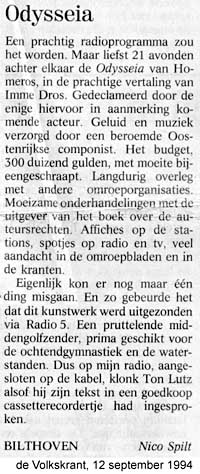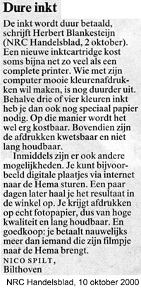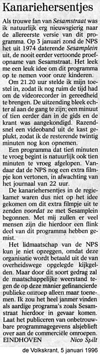 Twee krantenIn de Volkskrant van zaterdag 24 mei wordt een artikel uit het blad Nature aangehaald. Dat artikel gaat over de benadeling van vrouwen bij sollicitaties naar wetenschappelijke functies. Voordat dat artikel is gepubliceerd, heeft Nature het ter beoordeling voorgelegd aan drie vrouwen. Een paar uur later ploft NRC Handelsblad op de mat. Ook daarin aandacht voor het artikel in Nature. Aan het eind wordt gemeld dat de redactie van Nature het artikel heeft laten beoordelen door drie mannen. Drie vrouwen of drie mannen? Ik heb de rest van het weekend nagedacht over wat een logisch antwoord zou zijn, maar ik ben er niet uitgekomen. Maandagochtend 2 juni lees ik een bericht over een Duitse musicus, die is ontslagen omdat hij zich in een Israelisch hotel heeft misdragen. Het zou gaan om een contrabassist, aldus de Volkskrant. Ook 's avonds in NRC Handelsblad aandacht voor dit incident. De musicus blijkt nu opeens een hoornist te zijn. Een contrabas of een hoorn? In de context van de gebeurtenis is het verschil niet belangrijk, maar het houdt me die avond toch een poos bezig. Begrijp me goed: ik wil niet klagen. Het is tenslotte mijn eigen fout dat iktwee kranten lees. Nico Spilt, NRC Handelsblad 7 juni 1997 |