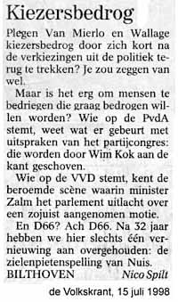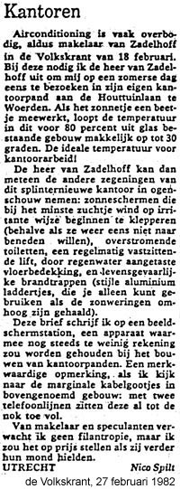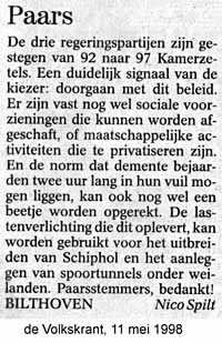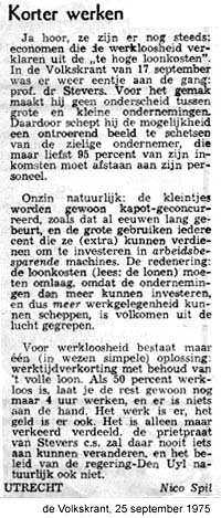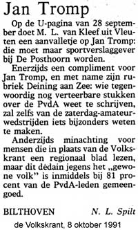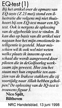 Brieven aan de krant: maatschappelijke vraagstukkenMijn eerste brief aan de krant stamt uit 1975, toen ik nog een heel erg linkse student was. En ook in de jaren daarna heb ik mij als onafhankelijk denker over uiteenlopende maatschappelijke, economische en wetenschappelijke vraagstukken uitgesproken. Hieronder een greep uit mijn oeuvre. Meestal een scan van het knipsel, maar soms heb ik alleen de tekst zoals die in de krant stond (bijna altijd is die versie gelijk aan de tekst die ik naar de redactie stuurde). Zie ook mijn brieven over spoorvraagstukken. |