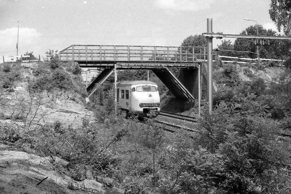 Hilversum, 1967 of wat eerder. Een treinstel mat.'36 is op weg naar Amsterdam. De foto is genomen vanaf de Crailose Brug. Links een zogeheten zigzagbaken. Foto Rienk Mebius. |