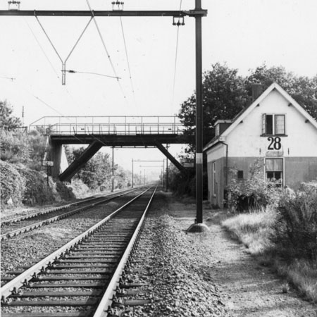 Bussum Zuid, 19 april 1969 (treinstel 765) en 5 augustus 2003 (ICM). Woning 26 heeft plaats moeten maken voor een trap tegen het talud. In de achtergrond de voetgangersbrug over de sporen. Onzichtbaar daarachter ligt een wegviaduct over het spoor. |