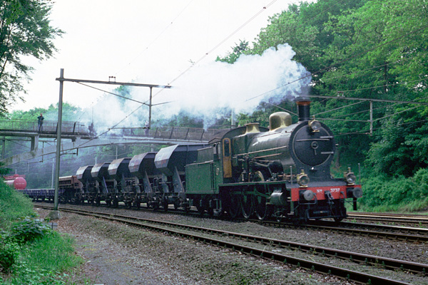 Baarn, 29 mei 1998. Loc 3737 rijdt met een niet geheel authentieke goederentrein door het land. Ze rijdt via spoor 803 richting Amersfoort. |