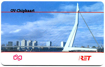 ErasmusbrugChipkaart met een foto van de Erasmusbrug in Rotterdam, bijgenaamd De Zwaan. Ook bekend van de ontwerpfout die na de oplevering in 1996 aan het licht kwam toen het een beetje ging waaien. Deze fout, waardoor de brug gevaarlijk ging zwabberen, is met wat kunstgrepen hersteld. De ontwerper van deze brug, Ben van Berkel, heeft grote bezwaren tegen het afbeelden van zijn geesteskind in publicaties. Daar heeft hij zelfs processen om gevoerd. Vandaar dat ik deze kaart graag op mijn site zet. |