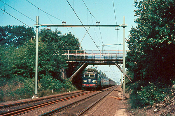 Hilversum, 21 augustus 1967. De Crailose brug met daaronder sneltrein 221 naar Enschede. De twee voorste rijtuigen hebben als bestemming Hannover. De trein wordt getrokken door een 1100. Foto Adriaan Pothuizen. |