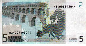 De geheimen van een eurobiljetAquaduct op 5-eurobiljet. De tekenaar hiervan moeten we maar geen echte bruggen laten ontwerpen. De helft van de pilaren van de bovenste brug rust op de zwakste plekken van de onderste brug. In 2013 verscheen een nieuwe versie van dit biljet, met nog steeds dezelfde constructiefout. Aan de letter voor het serienummer kon je vroeger zien uit welk land een eurobiljet kwam: B = Litouwen, C = Letland, D = Estland, E = Slowakije, F = Malta, G = Cyprus, H = Slovenië, L = Finland, M = Portugal, N = Oostenrijk, P = Nederland, R = Luxemburg, S = Italië, T = Ierland, U = Frankrijk, V = Spanje, X = Duitsland, Y = Griekenland, Z = België. (Op biljetten gedrukt na 2013 staan twee letters voor het serienummer. Hieraan is het land van uitgifte niet meer te zien, alleen wie het biljet heeft gedrukt. Bijvoorbeeld eerste letter P = Joh. Enschedé in Haarlem.) |