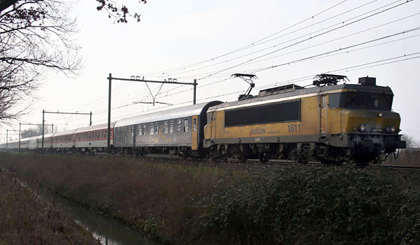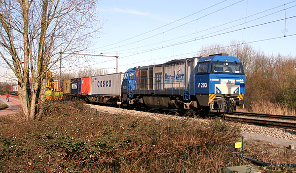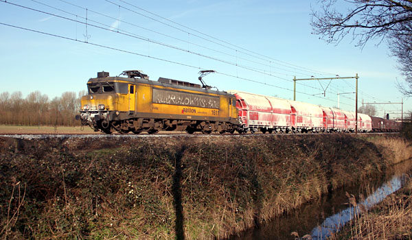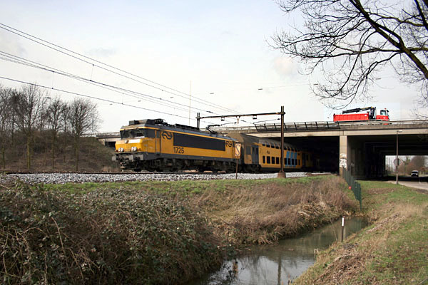Bunnik en omgeving, 20 maart 2009. Loc 1611 met lege kalkwagens en staalwagens als trein 49665 op weg naar Hermalle (België). De bekende groene Belgische kalkwagens zijn na een verwoestende ontsporing bij Amsterdam niet meer welkom in Nederland. Ze zijn vervangen door rode zelflossers van DB Schenker. NMBS-locs 7777 en 7785 waren met Volvotrein 46252 op weg van België naar Duitsland. De trein is bedoeld voor het transport van auto-onderdelen, maar er was dit keer weinig meer te vervoeren dan 18 lege wagens (voor wie sleetse grappen niet schuwt: de trein vervoerde zeilbotenbrandstof). De locs van de reeks 77 rijden altijd als koppel door Nederland, zodat er steeds met een korte neus voorop gereden kan worden. Dit is nodig om de links zittende machinist goed uitzicht te geven op laaggeplaatste seinen. Hierna fietste ik snel naar een andere spoorlijn. Hier zag ik loc V203 van de Rurtalbahn met containertrein 43953 op weg naar Linz. |