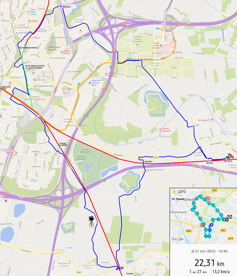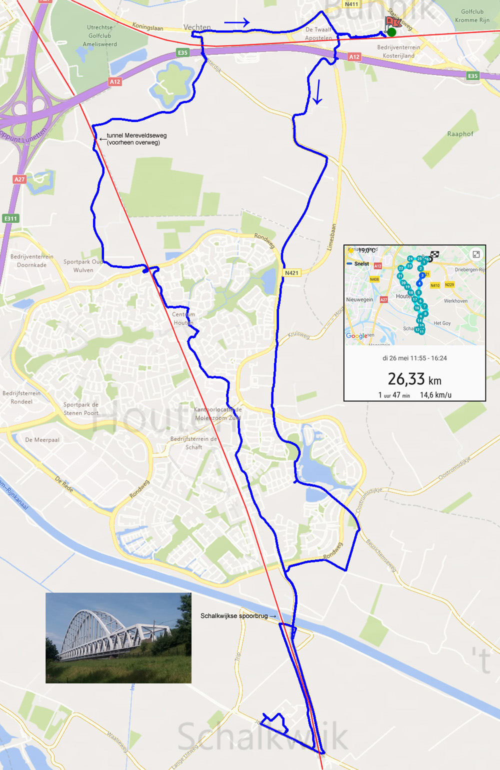Hier zie je de route die ik aflegde op 26 mei 2020. Bij Bunnik stak ik via een loopbrug de A12 over. Daarna fietste ik via een toeristische route buiten Houten om naar Schalkwijk. Daar liggen een spoorbrug en een wegbrug over het Amsterdam-Rijnkanaal (een ontwerp van Anton Mussert). Tot vlak voor de spoorbrug is de spoorlijn viersporig, daarna tweesporig. Bij Schalkwijk ligt de eerste overweg die je passeert als je met de trein van Amsterdam naar Den Bosch reist. Na een paar goederentreinen te hebben gefilmd maakte ik een rondje door Schalkwijk – een paar straten, een kleine supermarkt en een veel te grote kerk – en kwam ik langs de plek waar volgens mij vroeger het stationsgebouw heeft gestaan. Daarna fietste ik via Houten en Vechten weer terug naar Bunnik. |