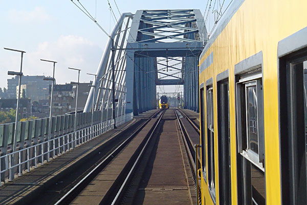 Waalbrug bij Nijmegen, 24 september 2005. Hans Hartemink hing uit het raam van treinstel 186 en maakte deze foto van een tegenligger. |