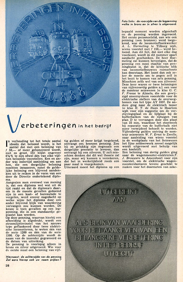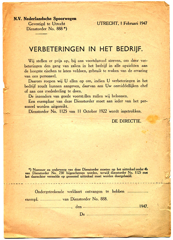 Bij dienstorder werd op 1 februari 1947 de nieuwe ideeënbus van de Nederlandsche Spoorwegen in het leven geroepen. Medewerkers konden hun verbetervoorstellen insturen en maakten kans op een beloning en een vermelding in het personeelsblad Nieuw Spoor, later de Koppeling. Ook zijn er penningen uitgereikt. |