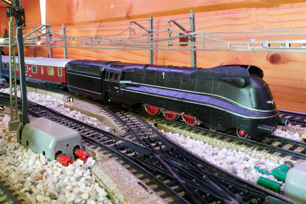 Gestroomlijnde loc van de Baureihe 03.10. Zoals veel andere Duitse sneltreinlocs uit de jaren 30 en 40 was deze serie voorzien van stroomlijnbeplating. Onder de adelaar op de neus van de trein hoort eigenlijk een hakenkruis te zitten, maar dat is op dit HO-model weggelaten. Bron: Fleischmann-catalogus 1981/82. |