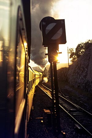 Ulm, 16 september 1971. Loc 003 131 vertrekt in het avondlicht naar Schelklingen. Onderste foto: In Schelklingen is geen draaischijf, zodat de loc achteruit moest terugrijden naar Ulm. Een rit op de voetplaat liet ik mij natuurlijk niet ontzeggen, maar ik ontdekte wel dat het 's avonds op een achteruitrijdende loc behoorlijk koud kan zijn. |