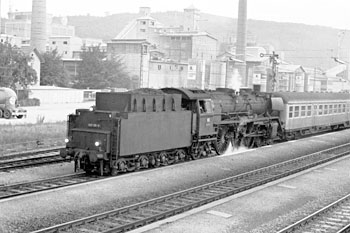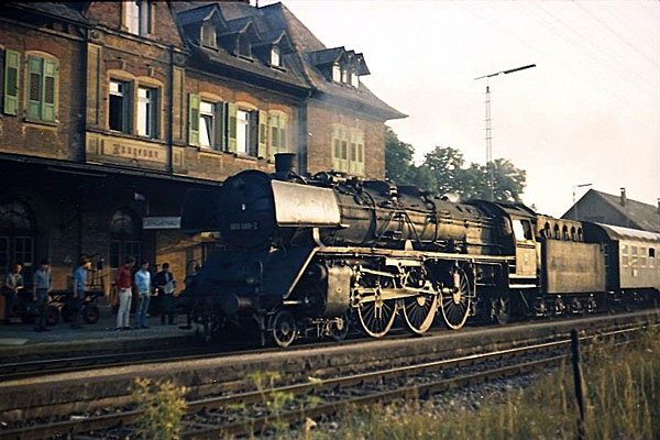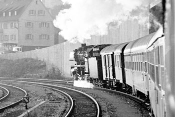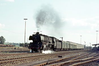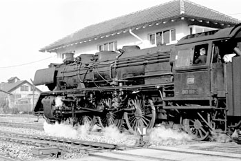 Aulendorf, 17 september 1971. Loc 003 088 vertrekt met een trein van Friedrichshafen naar Ulm. In december 1972 ging deze loc, als laatste 03 van de DB, buiten dienst. |