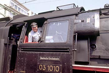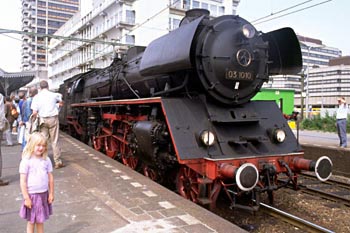 Utrecht, 20 juli 1989. De machinist van loc 03 1010. Op het perron mijn dochter Karin. |