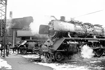 Bw Ulm, 4 maart 1971. Loc 003 168 in de loods. Buiten staan verschillende soortgenoten in de snijdende kou te wachten op hun volgende inzet. |