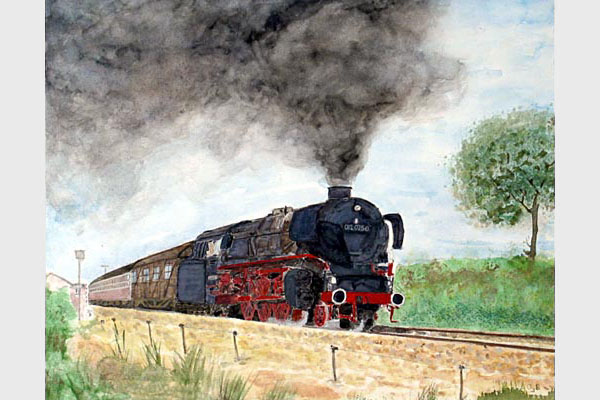 Aschendorf, 18 augustus 1974. Loc 012 075 op weg naar Rheine. Aquarel Elly Hofsteenge. |