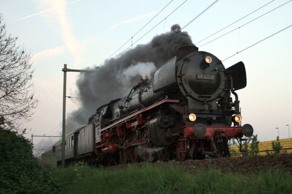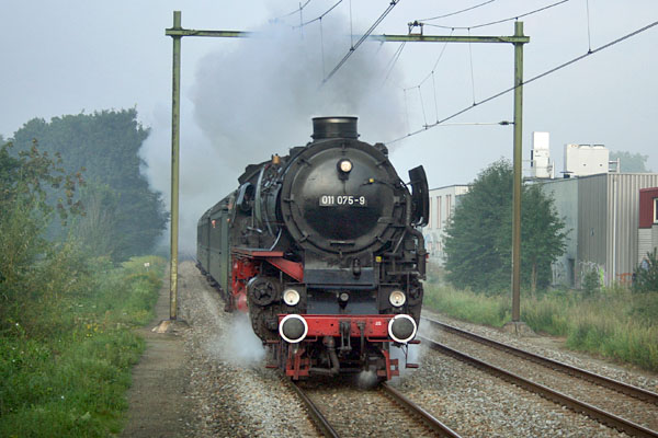 Bentheim, 28 mei 2005. De SSN bracht een bezoek aan Rheine. Tot Bentheim mocht de trein met stoom rijden, daarna nam dieselloc V200 116 het over. Loc 01 1075 was voorzien van nummerplaten waarop het nummer stond dat de loc in 1975 zou hebben gehad als die toen op kolen had gereden: 011 075. |