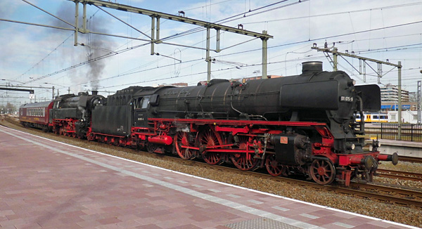 Rotterdam, 17 april 2015. Locs 011 075 en 65 018 van de SSN gaan een bezoek brengen aan 'Dampf ohne Grenzen', de jaarlijkse museumdagen in Bochum-Dahlhausen. Foto Henry Reedijk. |