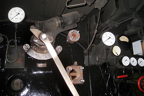 Foto 5: het sluitsysteem van de regulateur. Bij een noodremming (door ATB of PZB) wordt de regulateur door middel van luchtdruk dichtgeduwd. Dat wil zeggen bijna, want er moet voldoende stoomdruk overblijven om de trek op het vuur te waarborgen. Anders bestaat het gevaar dat bij een remingreep, terwijl op dat moment de stoker bezig is kolen op het vuur te gooien, er vlammen in het machinistenhuis slaan. |