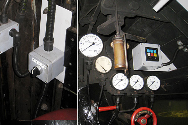 Foto 2: links de schakelaar waarmee gekozen kan worden tussen ATB (Nederland) en PZB (Duitsland). Rechts een ander kastje waarop het Indusi-signaal wordt weergegeven, ter hoogte van de machinist. |