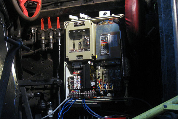 Foto 6: installatie waarmee de rijrichting van de loc wordt doorgegeven aan de PZB-apparatuur. Op het ganghendel is een pal gemonteerd die twee schakelaars bedient. Op deze foto staat het ganghendel in de stand "vooruit". In de stand "achteruit" bevindt de pal zich links van de schakelaars. In de nulstand (loc staat stil) zit de pal tussen de twee schakelaars. Deze constructie is een Nederlandse uitvinding! |
