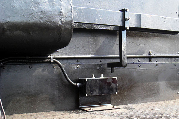 Foto 3: het ATB-kastje dat is aangesloten op de treinremkraan (daarboven zit de locomotiefremkraan). In tegenstelling tot PZB meet de ATB niet of de trein werkelijk voldoende afremt, maar alleen of de remkraan in een bepaalde stand is gedraaid. |