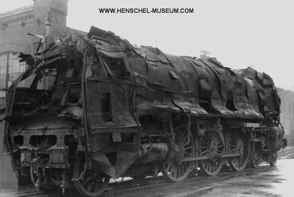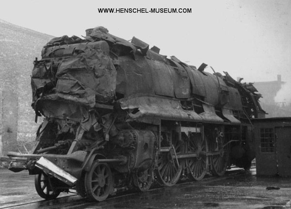 Zo zag loc 01 1075 er kort na de oorlog uit. Alle locs van dit type die de oorlog hadden overleefd kwamen bij de DB terecht. Aanvankelijk was men van plan om ze te slopen, maar vanwege het grote locomotieftekort ging dat niet door. De meeste locs werden opgeknapt, waarbij ze werden ontdaan van de stroomlijnbeplating. Ook kregen ze na enige tijd nieuwe ketels. Een groot deel van de locs werd bovendien omgebouwd op oliestook, waaronder de 01 1075 - de latere 012 075. Foto: www.henschel-museum.com. |