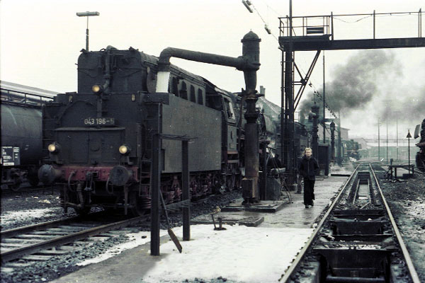 Bw Rheine, jaren zeventig. Loc 043 196 wordt voorzien van stookolie en water. Rechts in de voorgrond een put tussen de rails, waar je als onoplettend fotograaf makkelijk in zou kunnen vallen. Vandaar dat je een Bw alleen mocht bezoeken nadat je op het kantoor voor een klein bedrag een verzekering had afgesloten. Loc 043 196 staat tegenwoordig als monument bij station Salzbergen. Foto Gerard van Wieringen. |