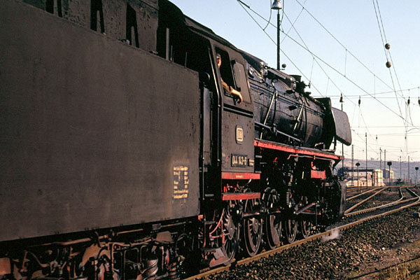 Ehrang, 15 augustus 1973. Aan het eind van de middag is het spitsuur: om de 10 minuten rolt een 044'er voorbij. Loc 044 143 loopt binnen met een trein uit de richting Koblenz. |