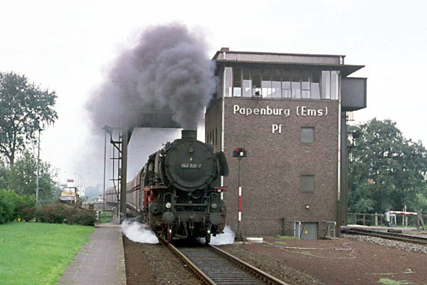 Lingen, 20 augustus 1974. Loc 043 094 is met een lege ertstrein op weg naar Rheine. Rechts in beeld AW Lingen. |