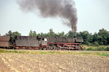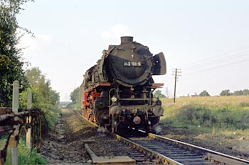 Elbergen, 20 augustus 1974. Een deel van de Emslandstrecke was enkelsporig. Op dit gedeelte zien we losse loc 043 196 voorbij komen. De 3 in het locnummer is witter dan de andere cijfers, wat er op duidt dat de loc nog niet zolang geleden is omgebouwd van kolenstook (044) naar oliestook (043). De volgende dag toont 043 196 wat ze waard is met een zware ertstrein bij Ihrhove. Deze locomotief is als monument bewaard gebleven in Salzbergen (zie foto verderop). |