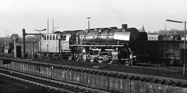 Bw Gelsenkirchen Bismarck, 6 december 1975. Loc 044 318 wordt bij aankomst in het Bahnbetriebswerk verzorgd. De loc neemt een nieuwe voorraad water, terwijl de jonge Heizer met de oliekan het nodige smeerwerk verricht en de oudere Lokführer op zijn gemak wacht tot hij weer verder kan. In de late namiddagzon staat de machine er glanzend bij. In de achtergrond loc 64 415, bestemd voor de VSM. Foto Rob van der Rest. |