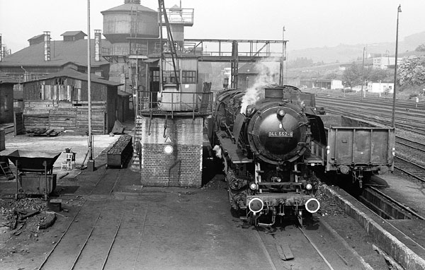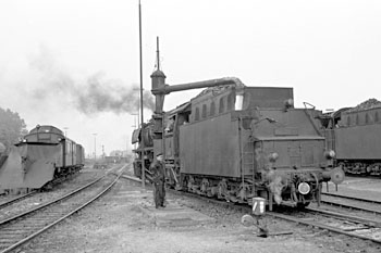 Hof, 2 september 1972. Loc 044 487 gaat zich in het Bw laven aan kolen, water en olie. Klik hier voor meer foto's in Hof. |