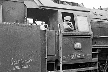 Rheine, 6 augustus 1970. Eerste foto: de machinist van 044 671 heeft er zo te zien een hard hoofd in. Misschien heeft dat iets te maken met het opschrift op de tender. Tweede foto: inderdaad, zonder water gaat het niet. Loc 044 314 wordt afgetankt. |