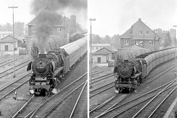 Rheine, 6 augustus 1970. Kort na elkaar vertrekken loc 012 058 en 043 438 met hun trein richting Emden. |