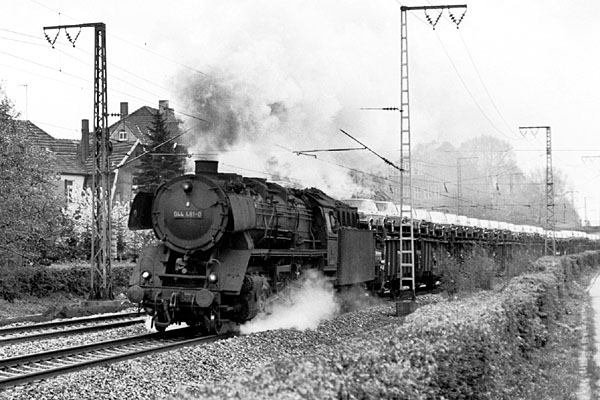 Rheine, 30 april 1975. Loc 044 481 vertrekt richting Emden met een lading nieuwe auto's. De trein rijdt over het linkerspoor, omdat men op het andere spoor bezig is met het aanleggen van bovenleiding. Deze locomotief is bewaard gebleven en staat nu als monument bij fabrikant Thyssen. |